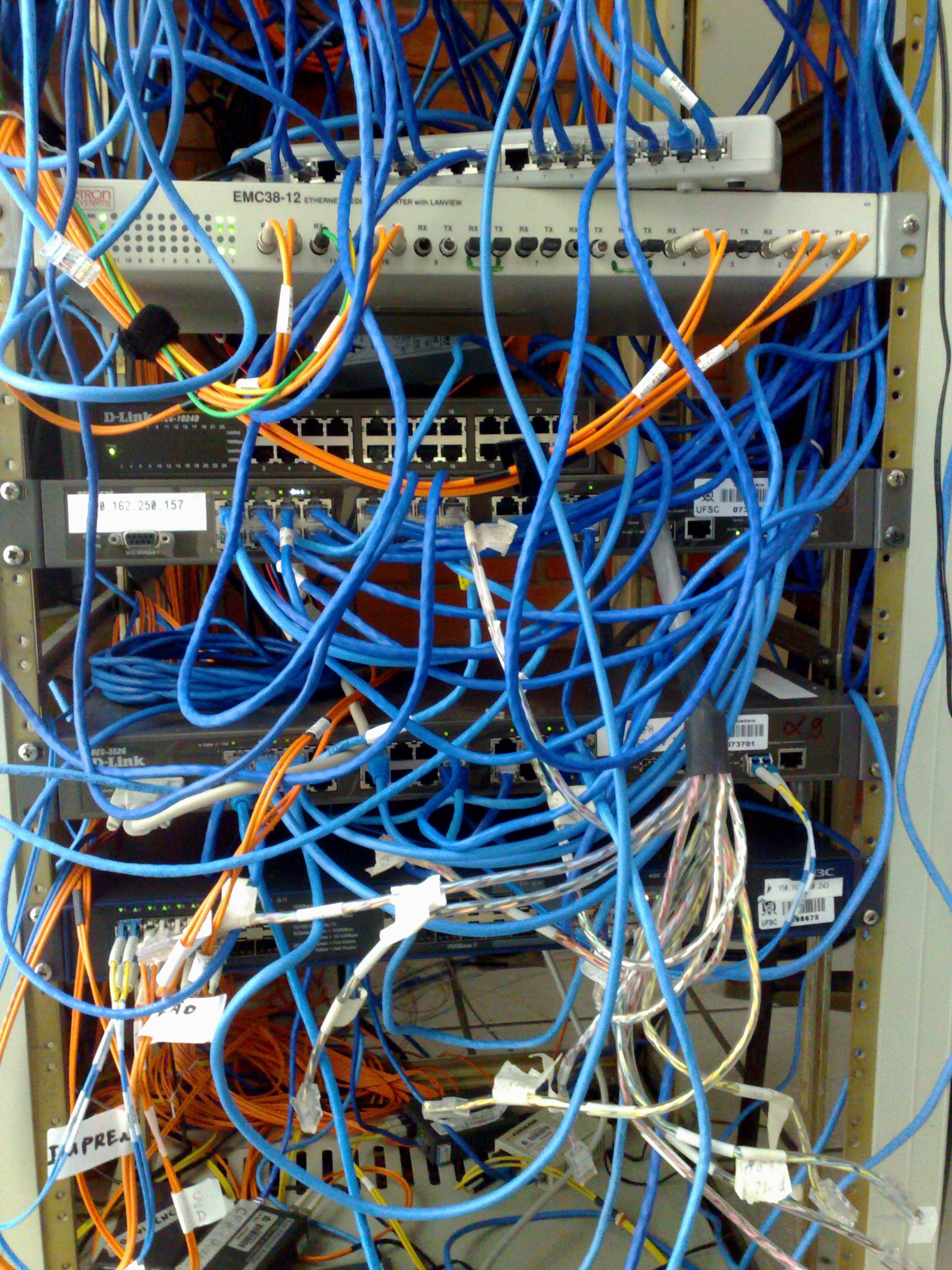 De lá saíram dois switches D-Link 3526 (um deles queimado) e mais três hubs (dois de 16 e um de 24 portas). Foram colocados dois switches D-Link 3100 de 48 portas empilhados (funcionando como um só equipamento).